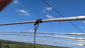 I wanted to do the same for the 17-4 antenna on top, but its horizontal guys limited the rotation. To rotate, one would have to temporarily remove the guys, not an easy job. But a call from SP7GXP pointed to a much simpler solution: unscrew the 15m driven element at a point closest to the boom, adjust, and put it back. I